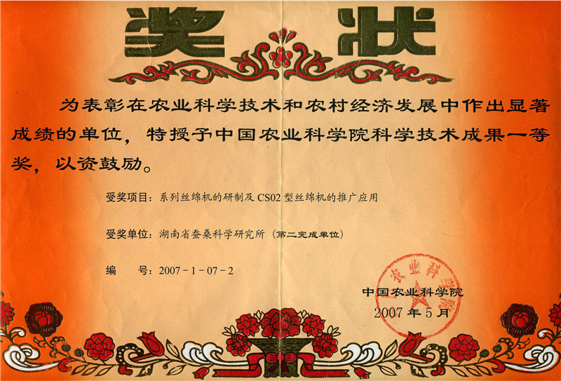 获奖名称及时间:2005年11月,“CS02型干丝绵机的研究报告”一文被中国农学会授予2005年度全国农业优秀科技论文奖;与中国农业科学院蚕业研究所共同申报中国农业科学院2005年度科技进步一等奖。